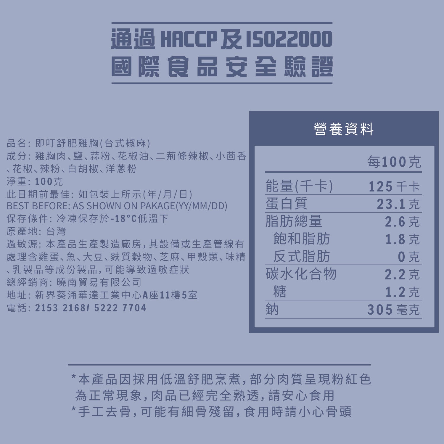 使用台灣的溫體雞肉,且經過大腸桿菌、抗生素、以及農藥殘留鑑驗。此外,我們在製作過程中亦除去多餘的添加,我們秉持著能做給家人吃的食品信念以及堅持創立初衷。